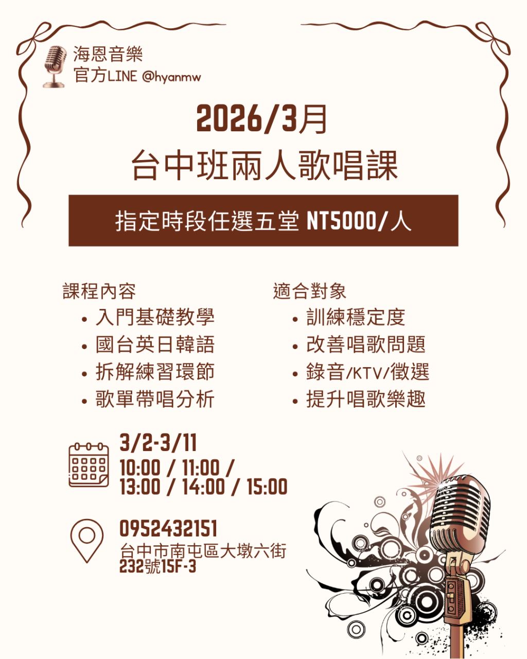 聲音再進化|台中歌唱課2026指定日期任選5堂|每堂上限2人|1人即開堂
